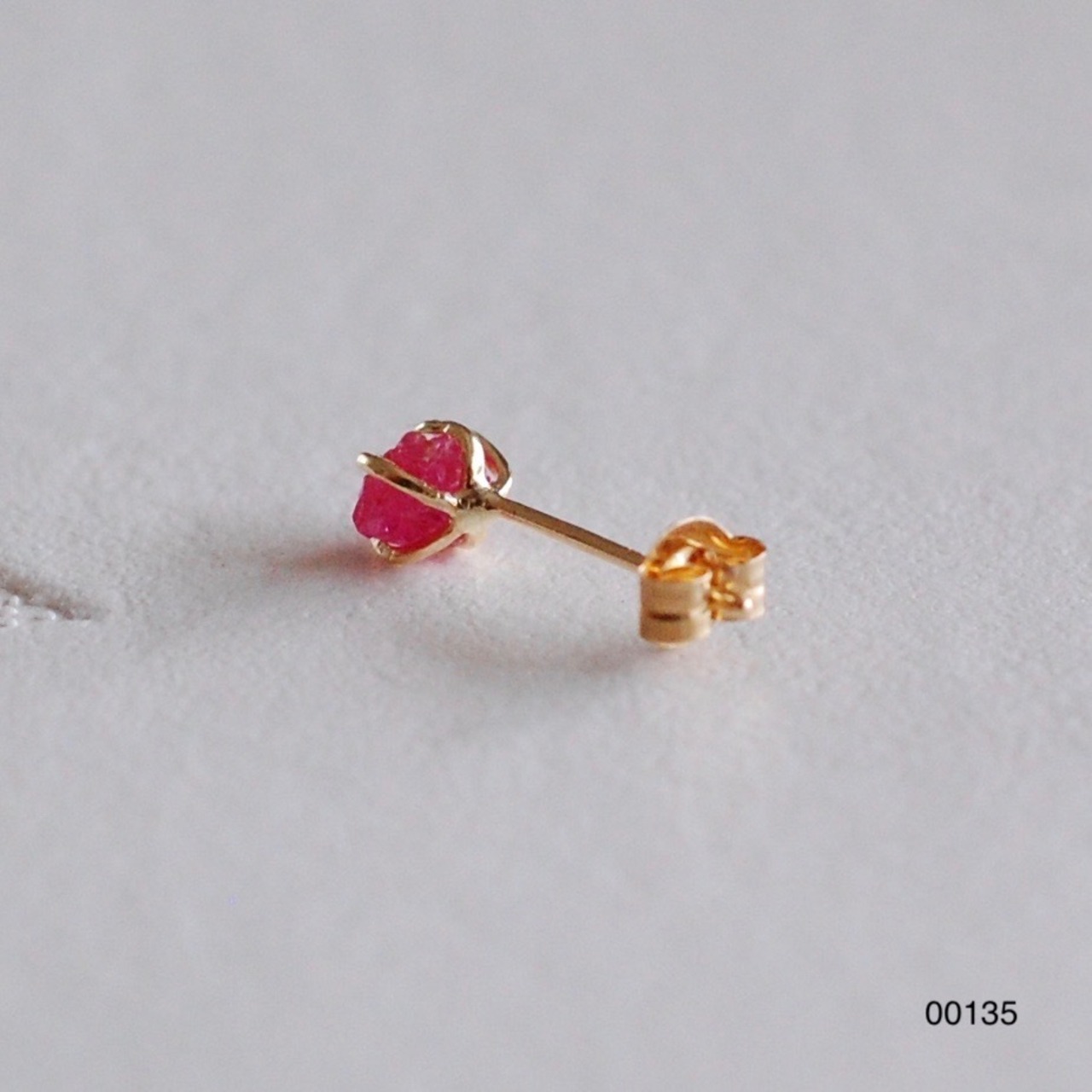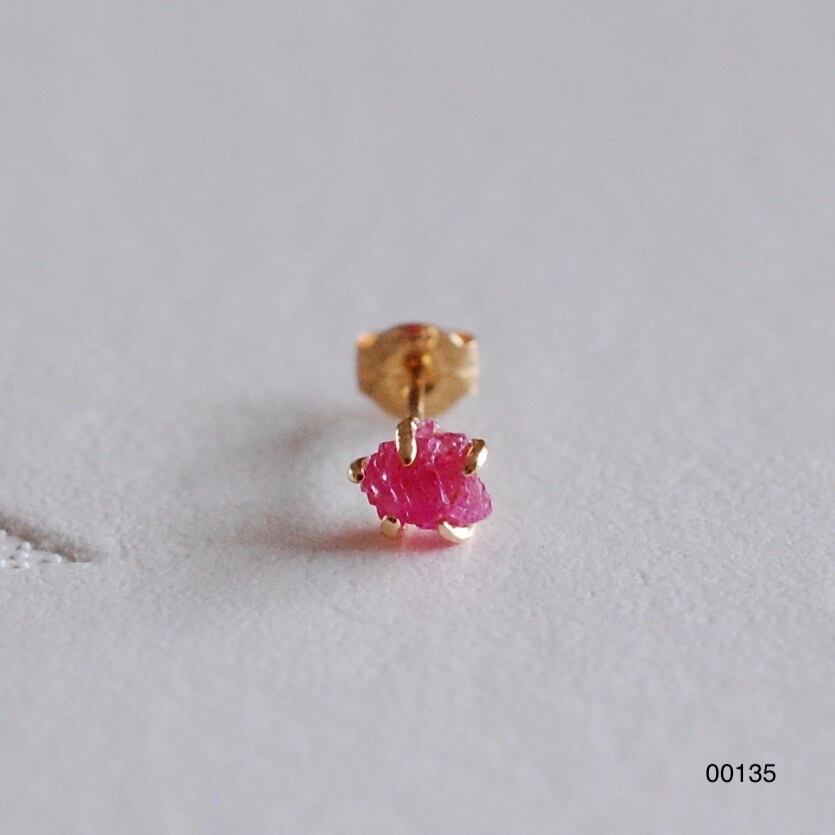 ルビーの原石をシンプルに爪留めした一粒ピアス。